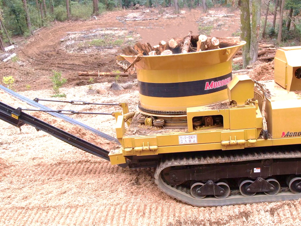 上から投入するタブ式は、太さが不均一な木材や幹が真っすぐでない広葉樹や、根に近い太い幹、大量の木材、枝葉の破砕なども可能な投入方法です。