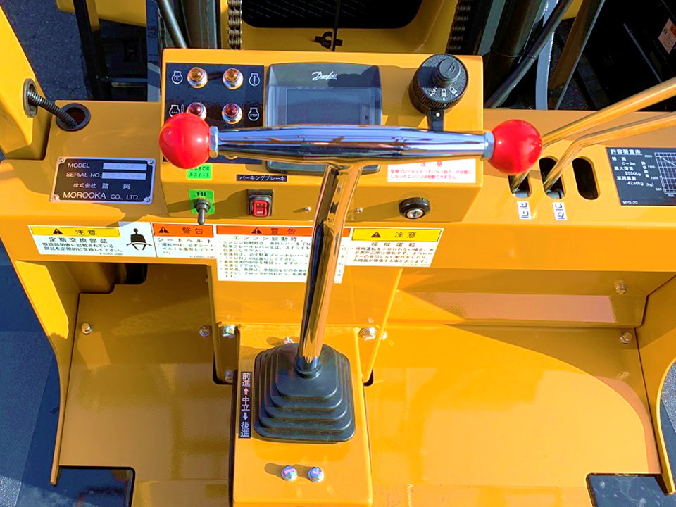 フォークの昇降、チルト操作は通常のフォークリフトと同様の操作感を実現。走行操作は諸岡独自の1本レバーによる簡単操作が可能です。