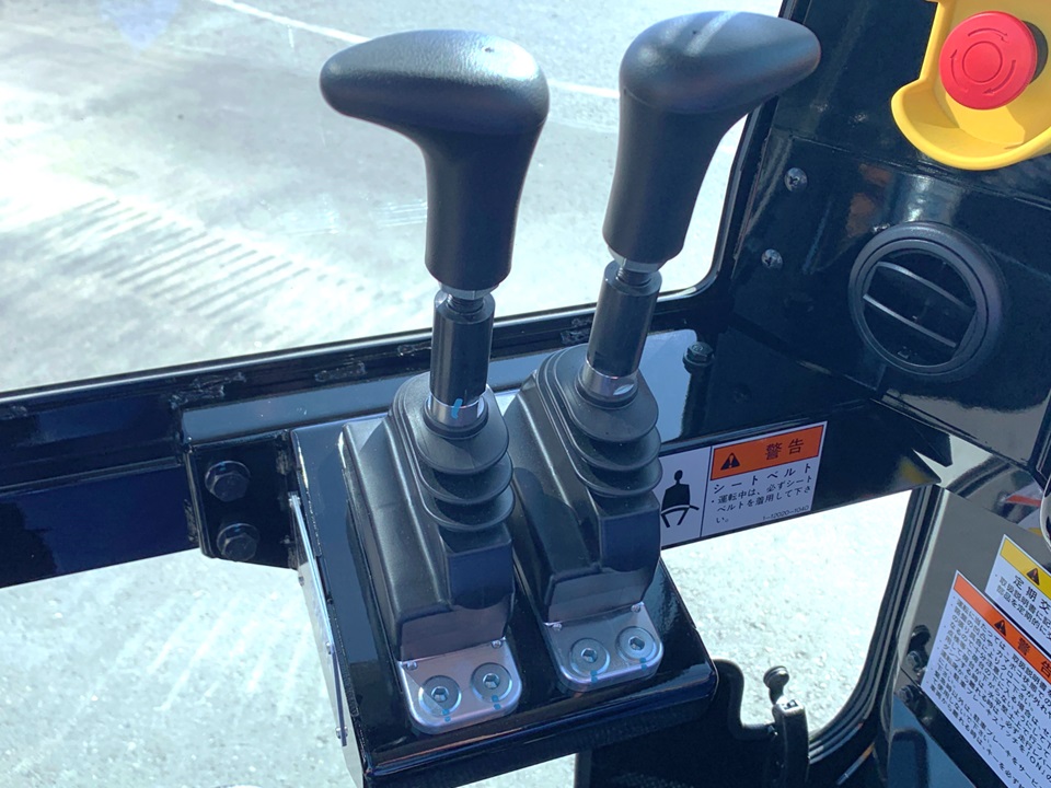 従来の油圧パイロット式走行レバーから電子制御式の走行レバーに改良。電子制御で走行をサポートし、スムーズで快適な操作感を実現しています。また、走行レバーのレイアウトを改良したことで足元空間が広がり、居住性が向上しています。