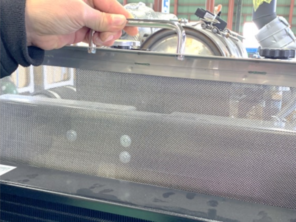 効率的な整備点検・メンテナンスを行えるように各機器を配置。開閉式のエアコンコンデンサ及び可倒式のオイルクーラ構造を取り入れ、さらにラジエータ前面に脱着式の防塵ネットで清掃性を向上。メンテナンスのしやすい構造となっています。