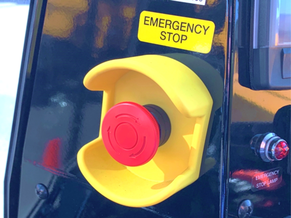 緊急停止スイッチを押すことにより車両のエンジンをストップさせ、緊急停止できます。(左)