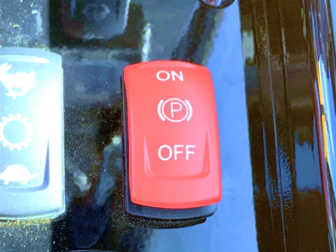 駐車ブレーキをONにしないとエンジンの始動ができないようになっており、エンジン始動後の意図しない動作を防止します。(右)