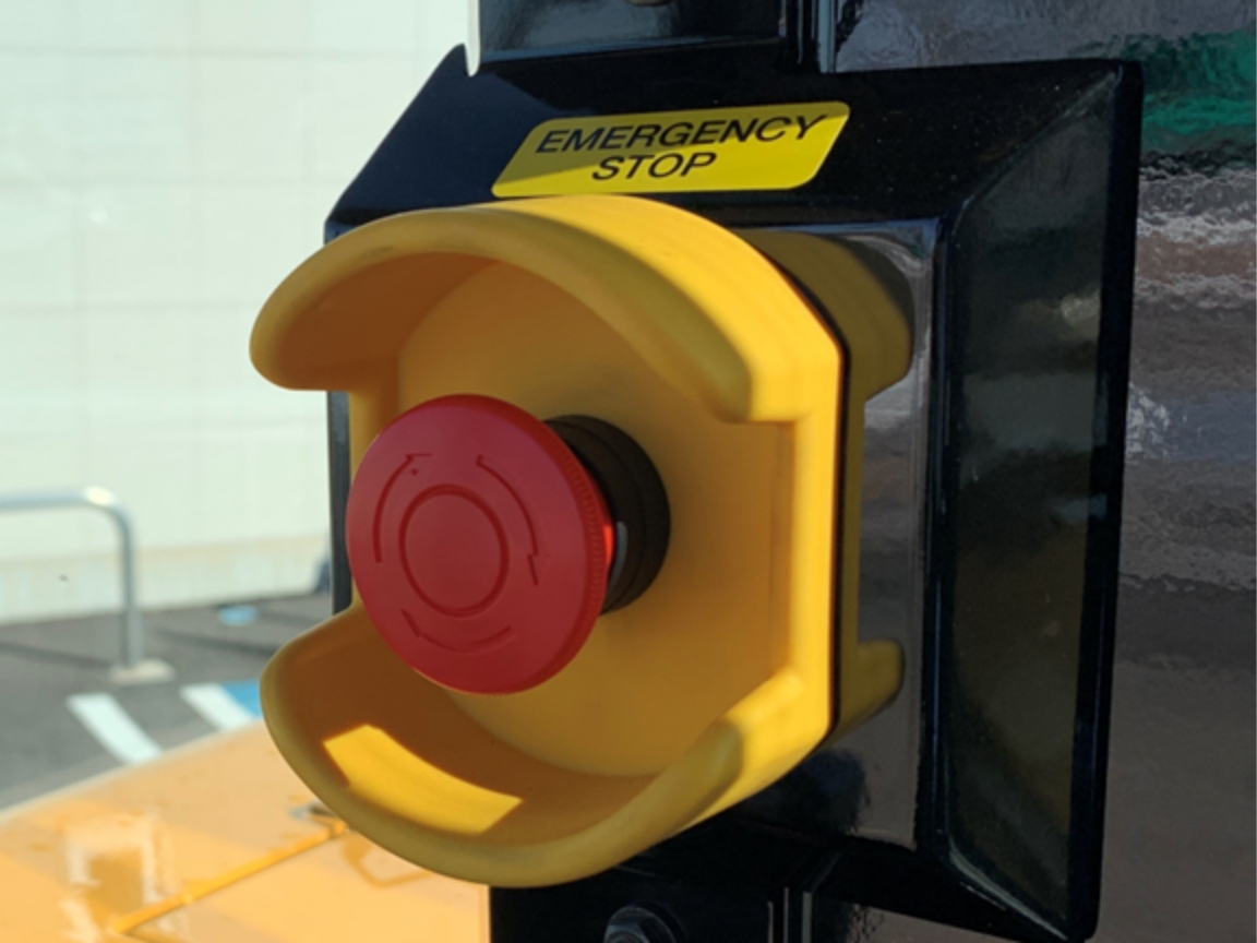 緊急停止スイッチを押すことにより車両のエンジンをストップさせ、緊急停止できます。(左)