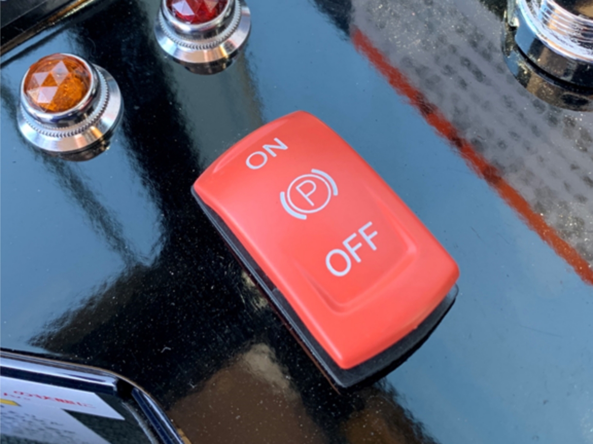 駐車ブレーキをONにしないとエンジンの始動ができないようになっており、エンジン始動後の意図しない動作を防止します。(右)