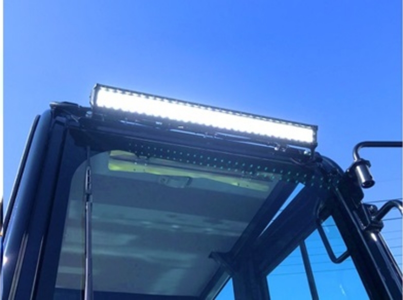 キャビン上部には大型LED前照灯を配置し夜間や暗所での作業がより安全になりました。(中央)
