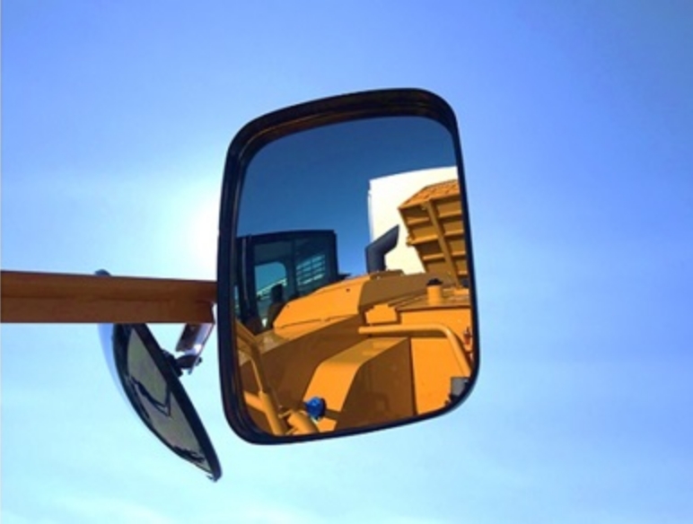 死角になりやすい周囲の安全確認を運転席からできるように大型ミラーを標準装備。作業時の安全性を高めます。(右)