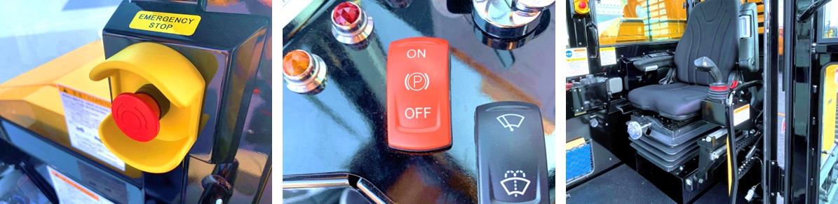 座席左側に安全ロックレバーを搭載しています。駐車ブレーキに加え安全ロックレバーを搭載することで、安全性が大幅向上し、意図しない動作による事故を防止します。(右)