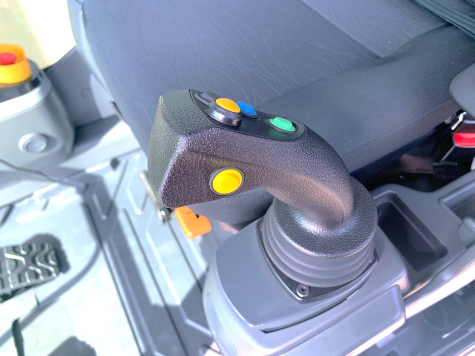 電子制御式の走行レバーを搭載。走行は左手のみで直感的な操作が可能。操作姿勢も従来機より改善され、オペレータの負荷も軽減しました。また、高低速切換、ホーン等の操作系統が走行レバーに集約されており、オペレータの意のままに車両を走行させることができます。